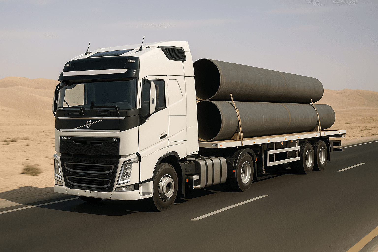 شاحنات مهيأة لنقل الأنابيب بمقاسات وأطوال متعددة مع أدوات تثبيت آمنة.